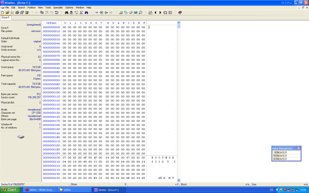 Díky za radu, vyzkoušel sjem to jak píšeš a když spustím ten winhex - tool - open disk, tak na mě vyskočí hláška: Svazek nepodporuje známý systém souborů. Přesvědčte se, jsou-li načteny všechny systémové ovladače a není li svazek poškozen. - Dám OK a pak se mi otevře tohle: